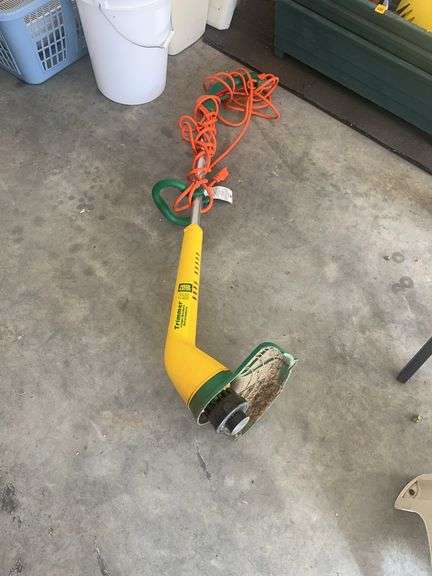 This is a used Weed Eater trimmer. It's yellow and green with an orange power cord.