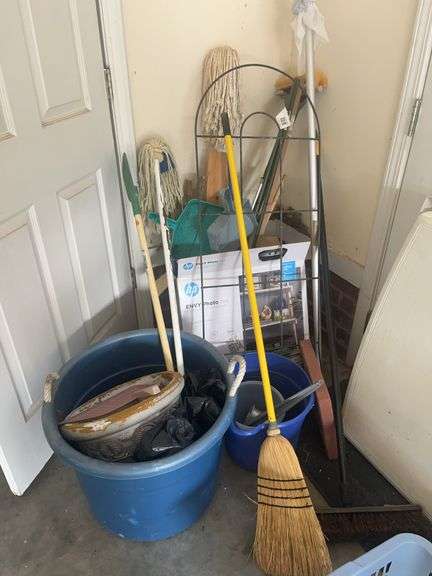 A collection of assorted cleaning and gardening supplies, including buckets, a broom, mops, dustpans, and other tools. Ideal for home cleaning or garden maintenance.