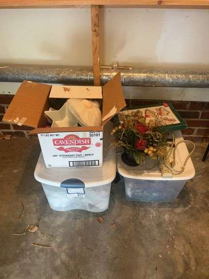 Collection of holiday decorations includes Santa ornaments, a snowman, a Christmas village house, seasonal tabletop décor, a dog figure with a santa hat, and other miscellaneous decorative items.