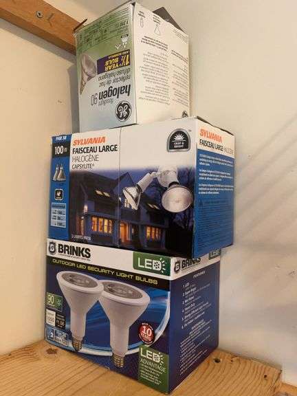 Mixed lot of light bulbs including Brinks outdoor LED security light bulbs, Sylvania Faisceau Large Halogen Capsylite bulbs, and GE floodlight halogen reflector bulbs. Some are still in the box.