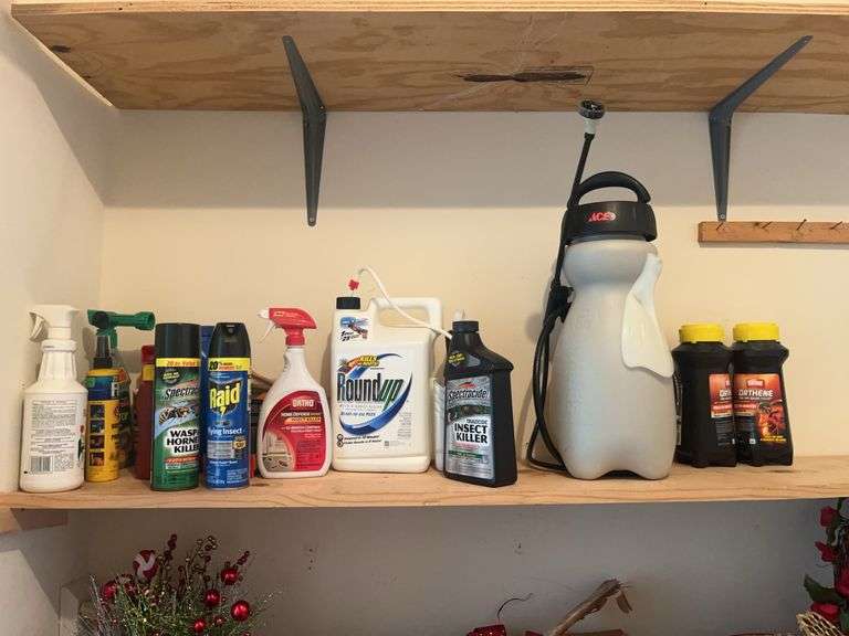 DescriptionSelection of various insecticides, pest control and weed control products, including Roundup weed and grass killer, Spectracide insect killer, Raid flying insect killer, Orthene fire ant killer, Ro-Pel Animal rodent & bird repellent, and other assorted spray bottles.
