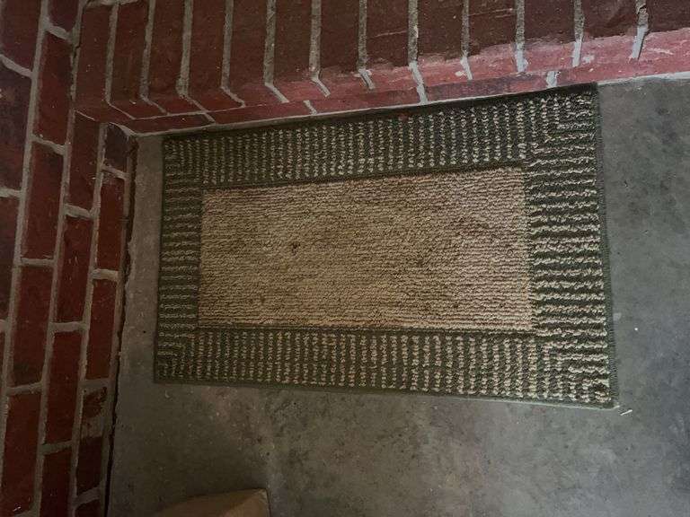Area rug featuring a green and beige pattern. Approx 2 x 3.
